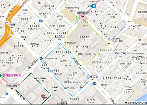 黃色框框:築地本願寺,如果時間很多可以晃晃看看。(欸我可能圈太大了,反正就是在那,外觀滿漂亮的)