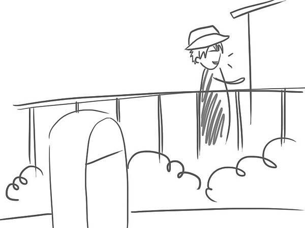 後來我轉移視線,假裝鎮定,一直到他離開前方那棟建築物,從我身邊走過..........